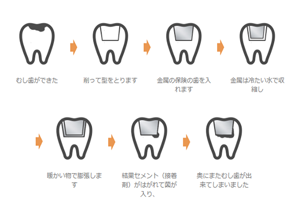 保険診療のむし歯治療で使用可能な素材は銀歯やレジン(プラスチック)のみなので、長期使用により金属の溶け出しや変色、密着性の低下などの問題が生じることがあります。