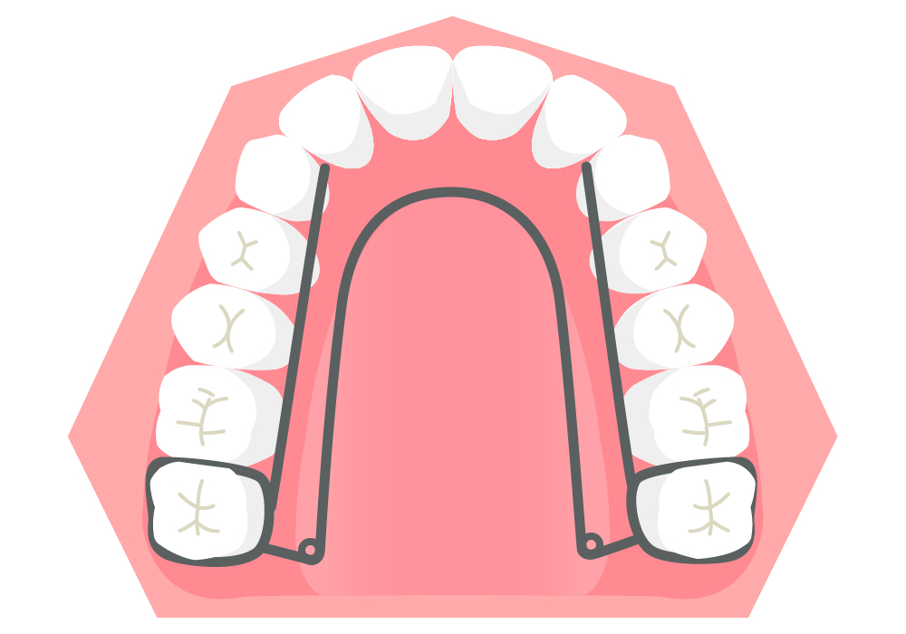 上顎用の拡大装置で、歯の並ぶスペースが足りない場合に使用します。奥歯に金属の装置を固定し、緩やかな力で上顎が側方へ成長するよう誘導し、 歯列の幅を広げます。