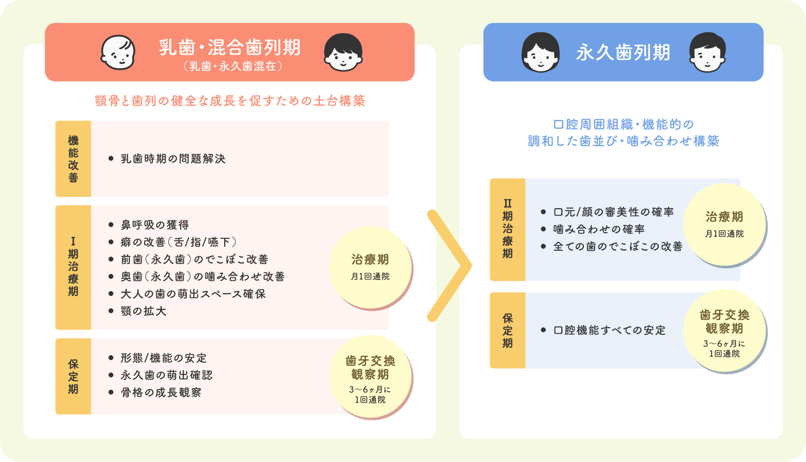 顎の成長をコントロールし、永久歯がきれいに生えるためのスペースを作ることが目的です。早期に矯正を始めることで、将来的な歯並びの改善を図り、Ⅱ期矯正が不要になる場合もあります。