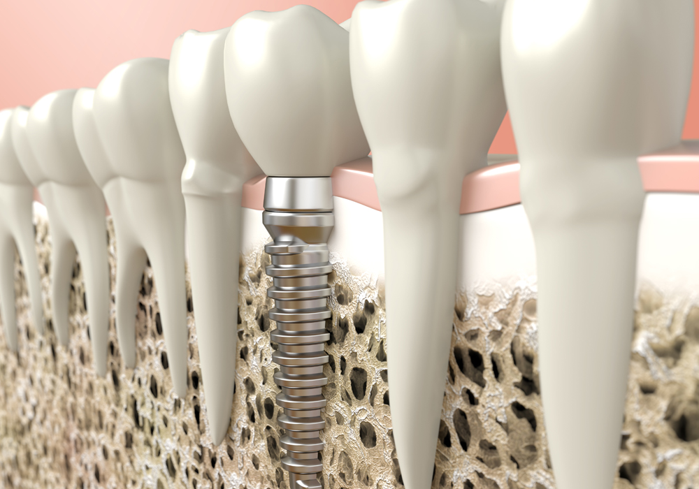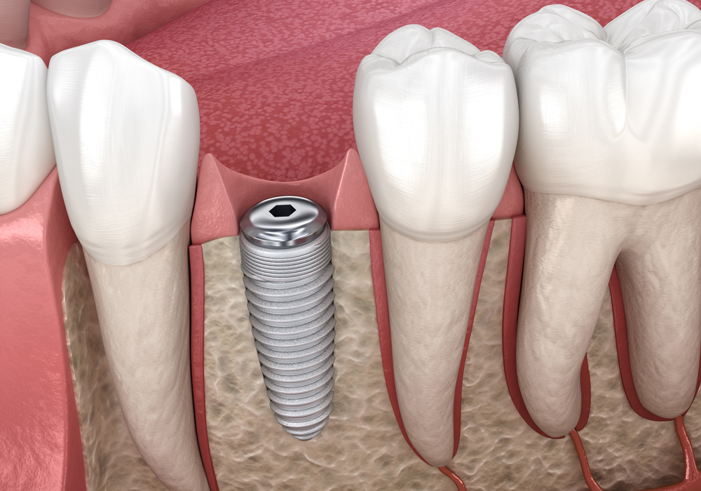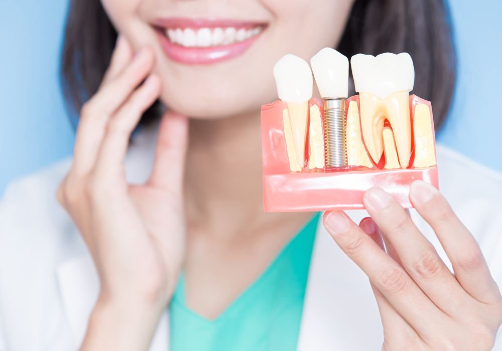 インプラントは、顎の骨に人工の歯根を埋め込むことで、天然歯に近い見た目と噛む力を再現できます。