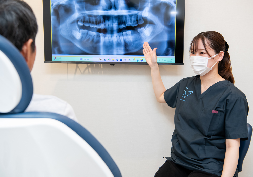 患者様のご希望をおうかがいした後、口腔内のCT画像を撮影し、精密検査を行います。その上で治療法や治療期間、治療費などを詳しくお話しいたします。ご心配なことやご不安なことは、何でもお気軽にご相談ください。